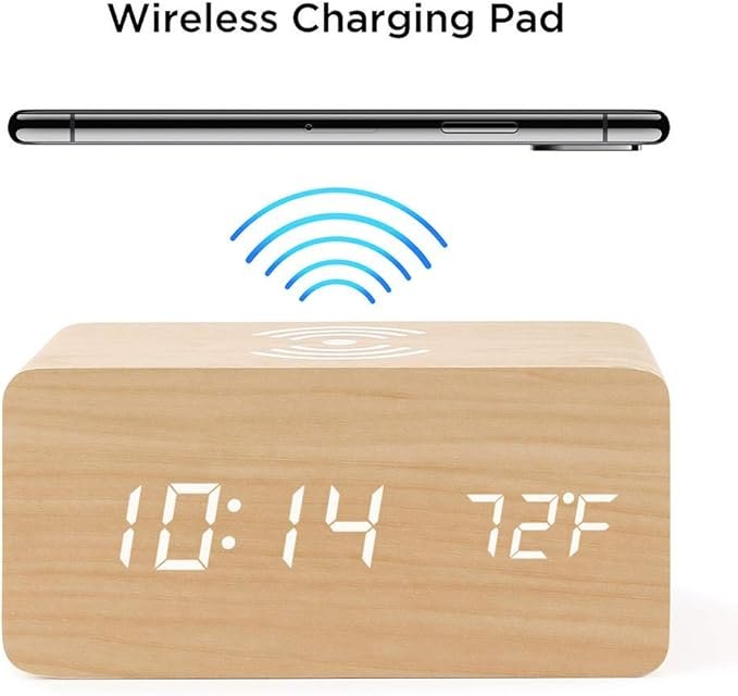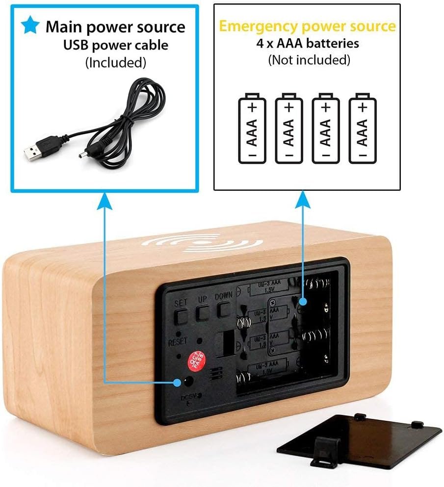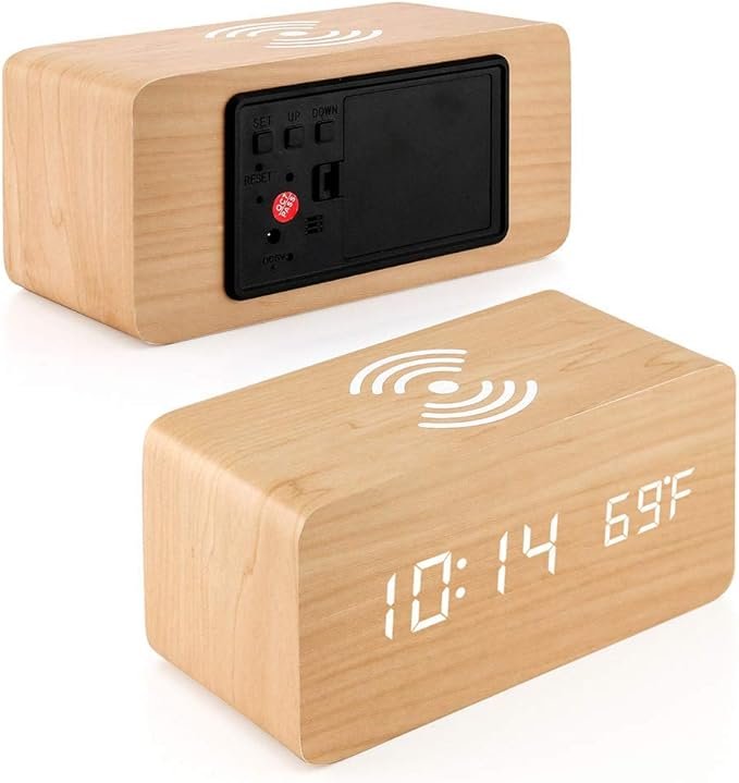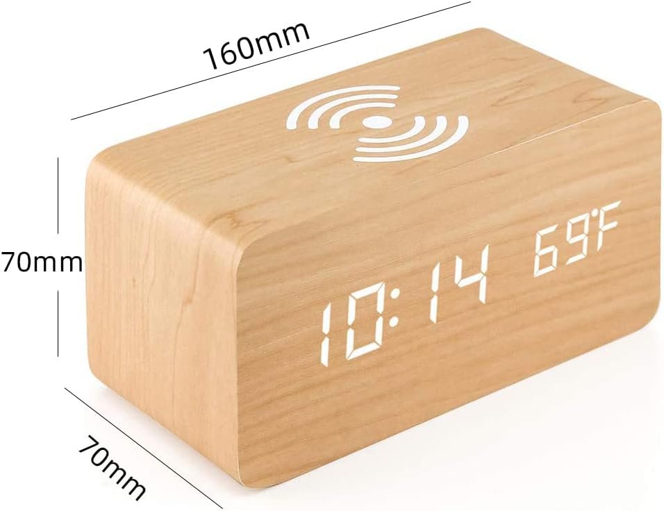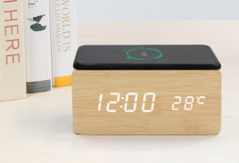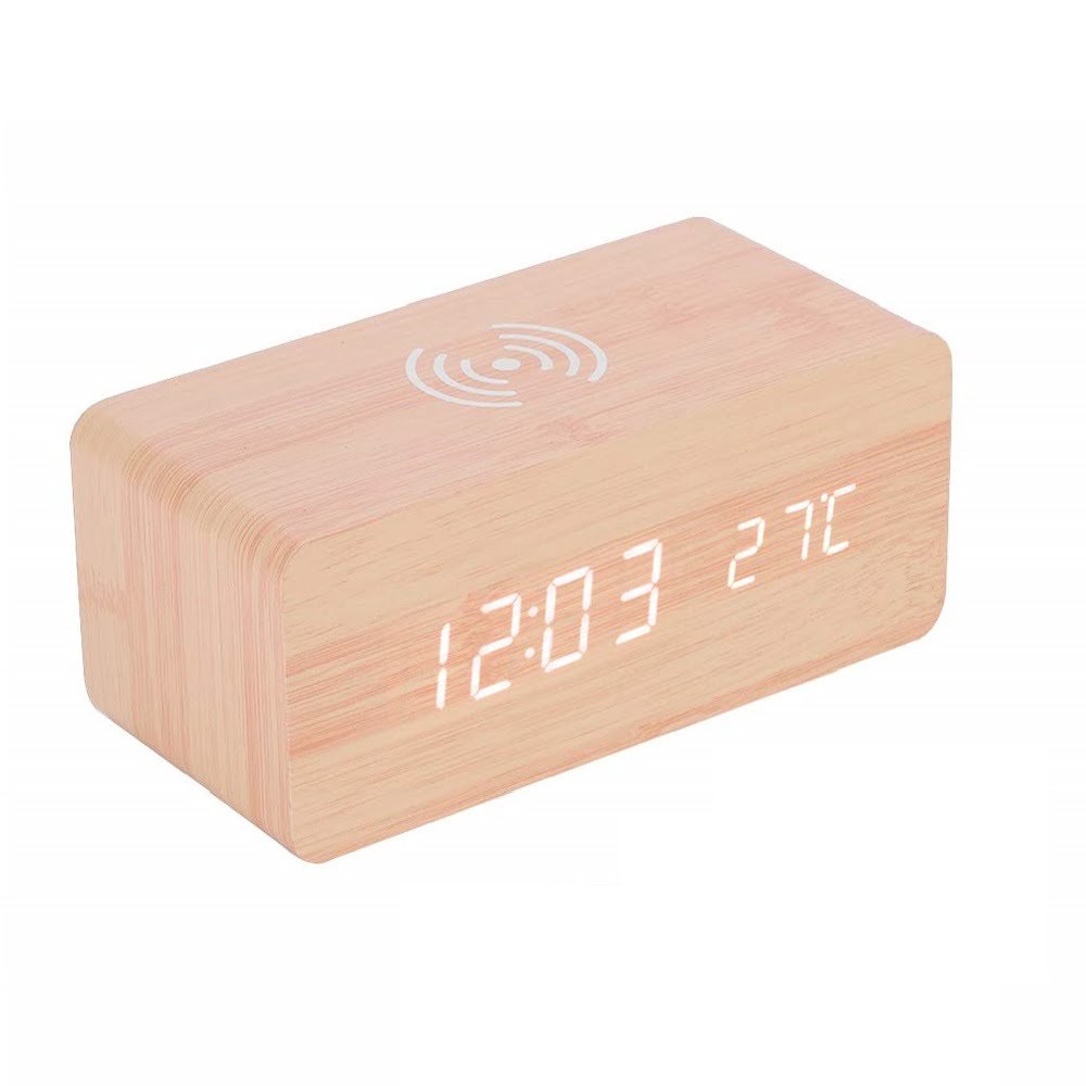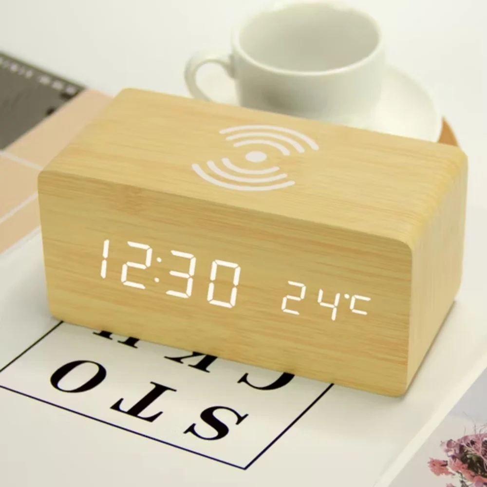 Eco-friendly Bamboo Digital Clock with Time and Temperature Display and Wireless Mobile Charger